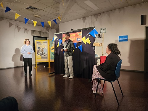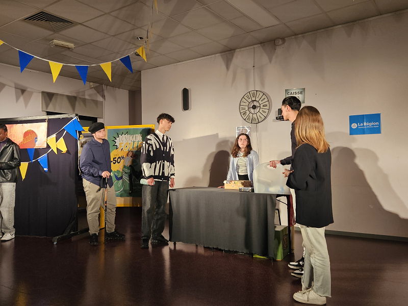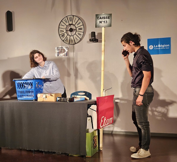 Cet atelier s’est déroulé sur l'année 2024-2025 le mardi matin sur un créneau de 3 heures avec la classe de 1 CAP EPC dans le cadre de la réalisation de leur chef d’œuvre, partie intégrante de leur formation. Nous leur avons proposé la réalisation d’une pièce de théâtre en lien avec leurs cursus de formation. Les tribulations d’une caissière sont un montage de petite scène de la vie d’une caissière ». L’objectif de cet atelier était d’aborder les compétences du Bloc 3 du référentiel CAP EPC « Conseiller et accompagner le client dans son parcours d’achat » et au-delà de se découvrir, apprendre à gérer son stress, s’exprimer et prendre la parole devant les autres puis un public.